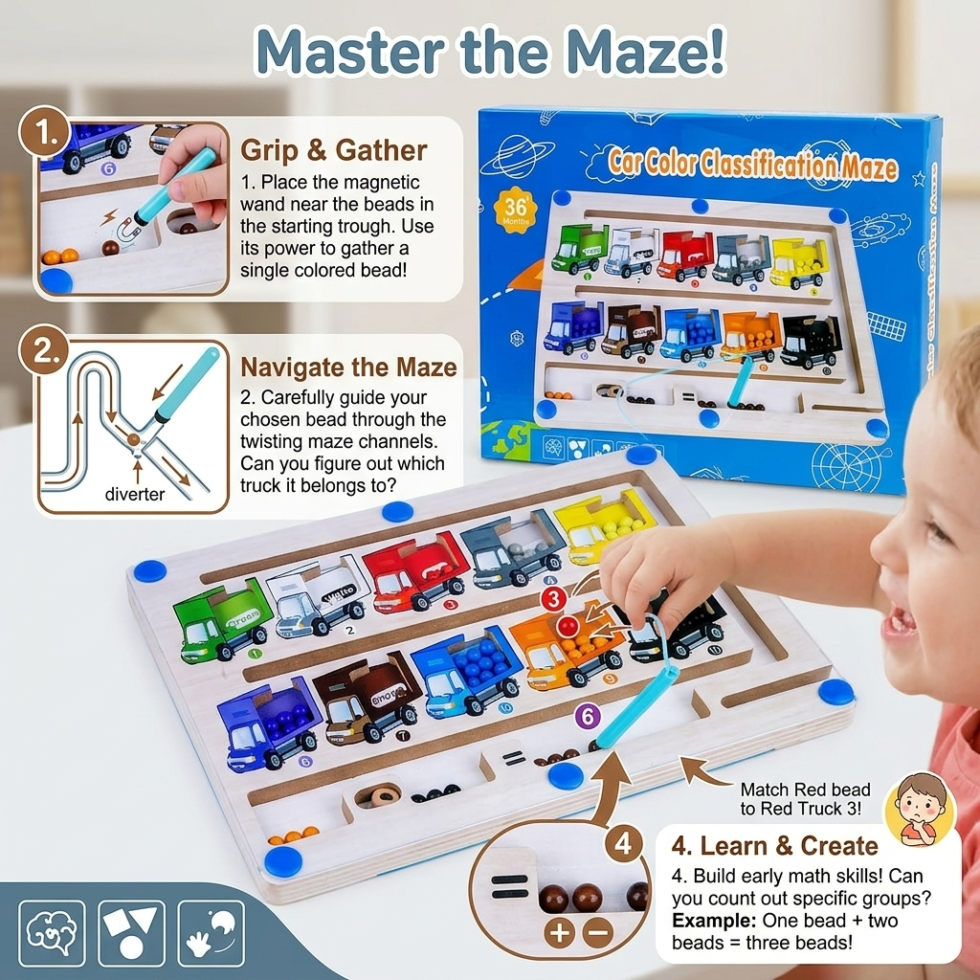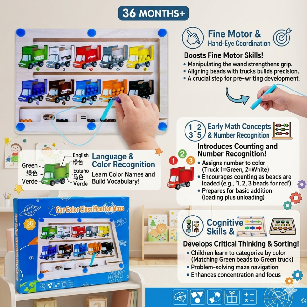 Make learning fun and interactive with the Car Colour & Number Classification Maze Wooden Magnetic Toy. This engaging educational toy helps children understand numbers and colors through a creative maze activity.