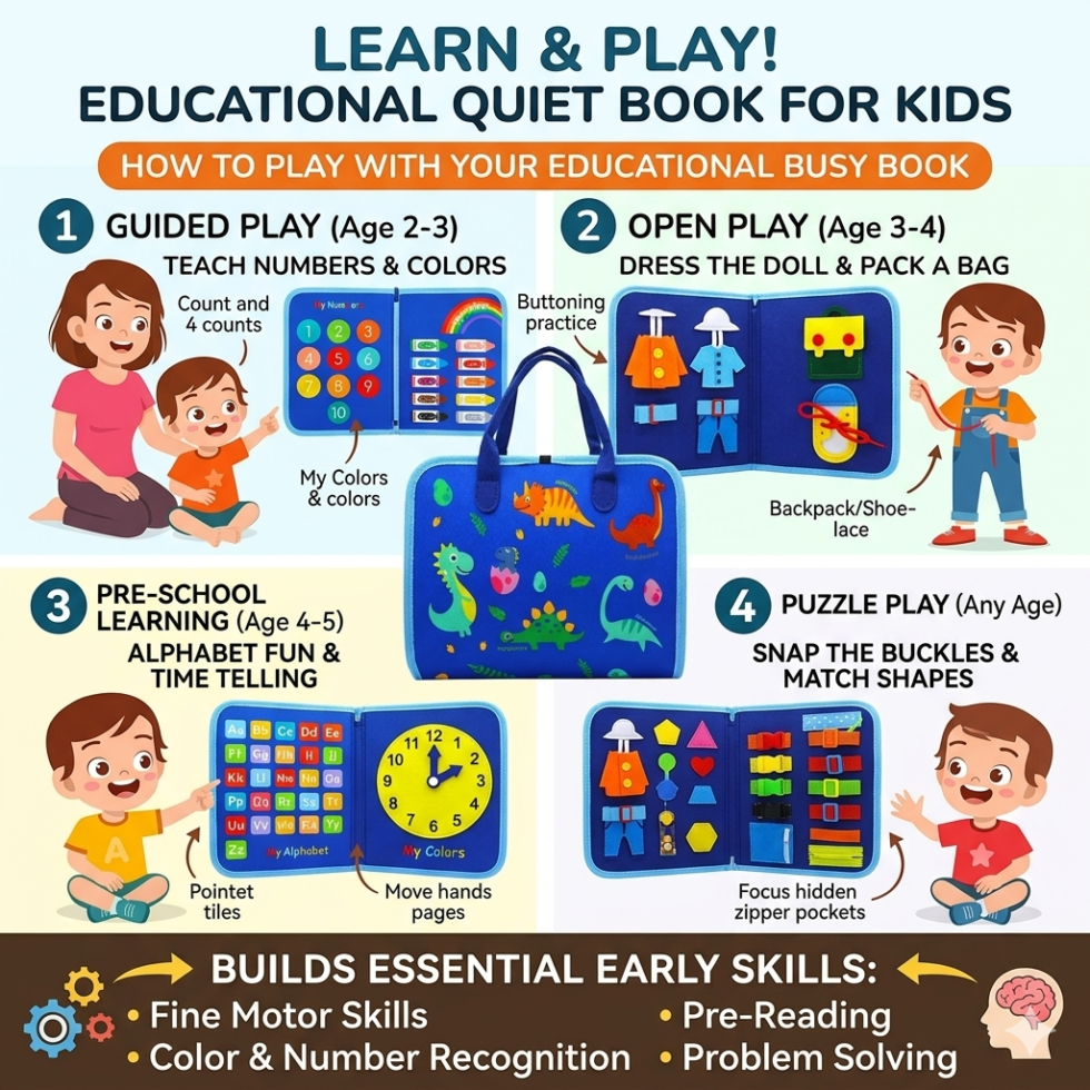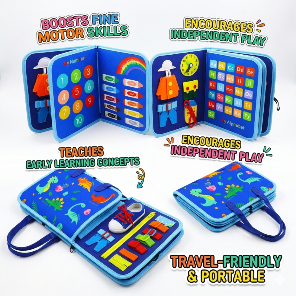 Dinosaur Montessori Busy Board for Toddlers – 3D Sensory Felt Activity Book for Fine Motor Skills & Letter Learning (CZ-0002)