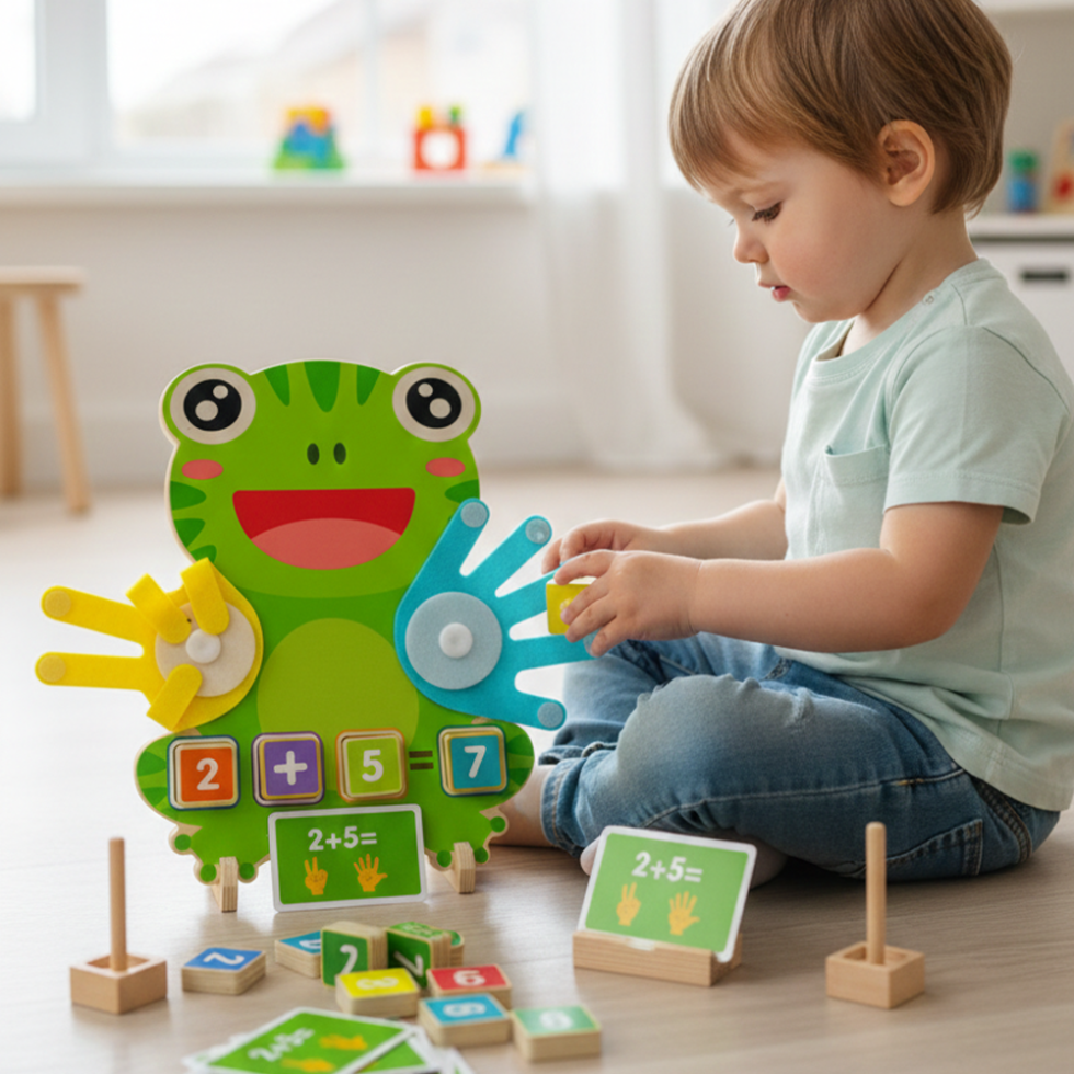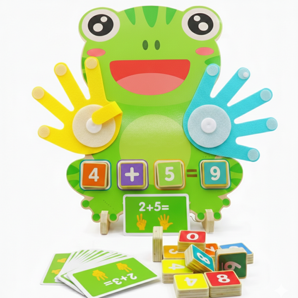 A fun wooden toy for kids 3+ years that makes counting, addition, and number recognition playful. Match numbers on the frog’s colorful fingers to solve simple equations, boosting hand-eye coordination, observation, and early math skills. Perfect for solo play or learning with parents.