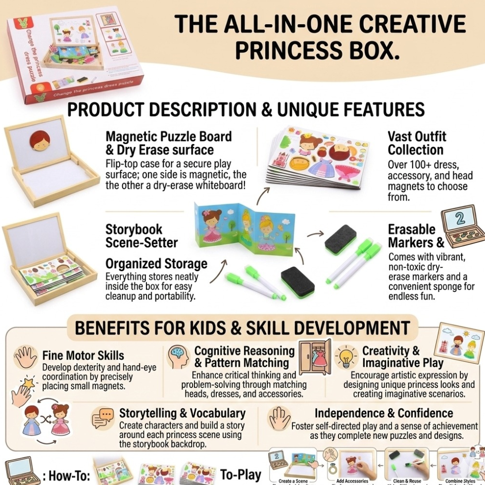 Make learning fun and interactive with the Kids 4-in-1 Magnetic Math & Drawing Montessori Wooden Case – Princess Theme! This versatile educational toy combines math, drawing, and creative learning into one compact and colorful wooden case.
