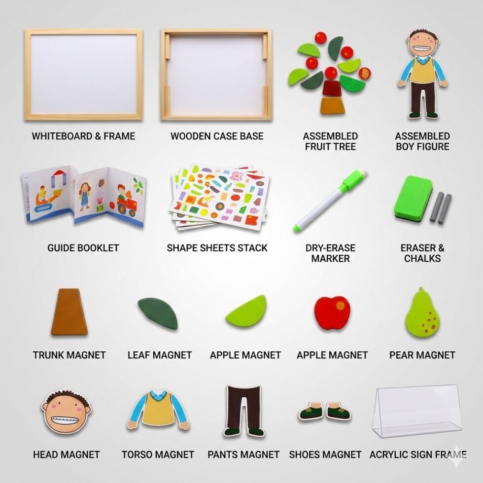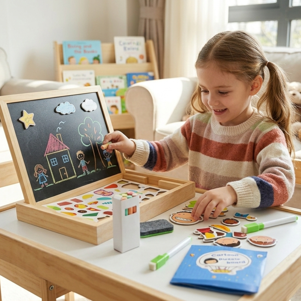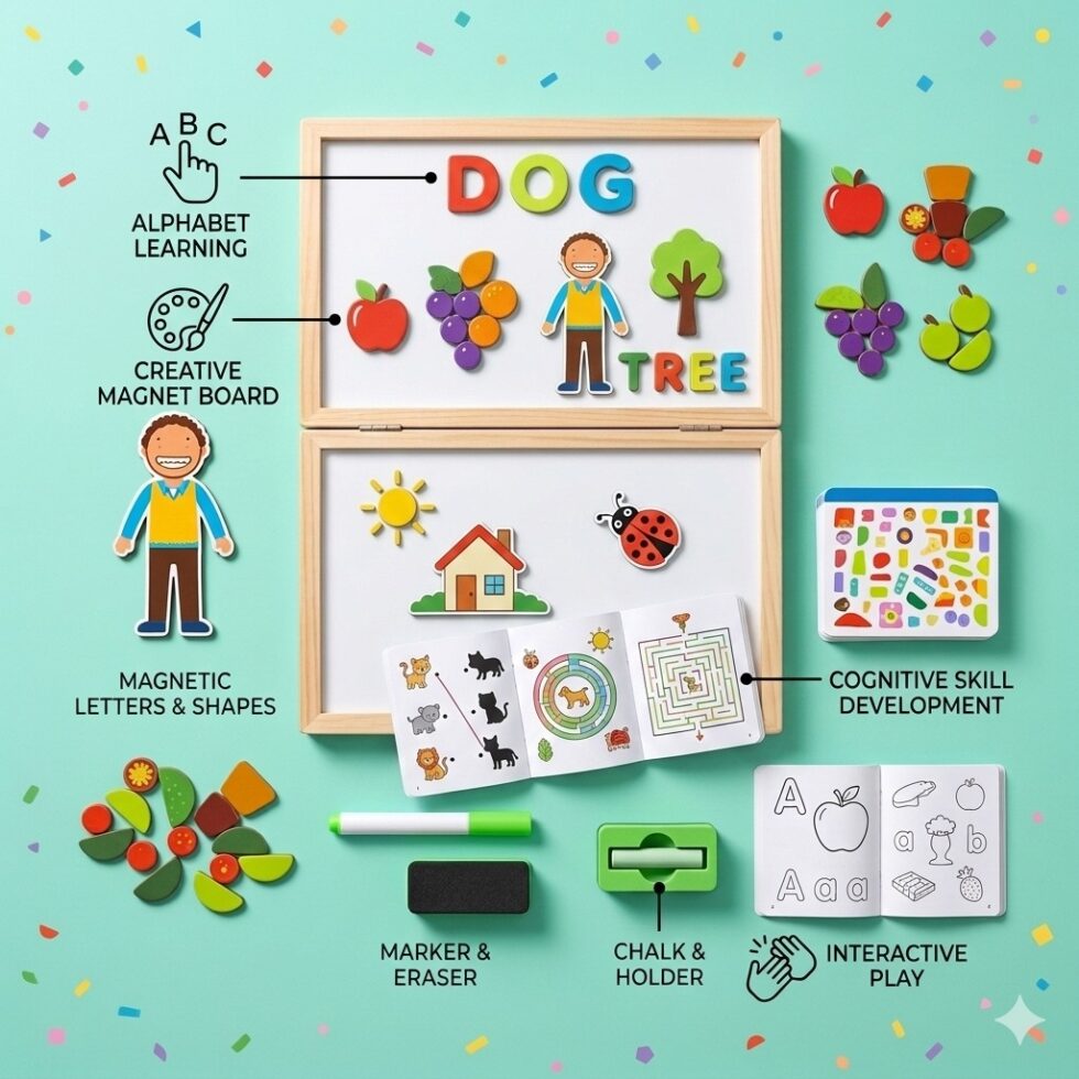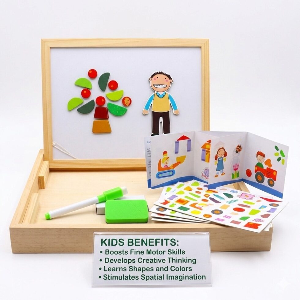 Children can use magnetic numbers and shapes to practice math skills, create beautiful drawings, and enjoy interactive activities that develop problem-solving, creativity, and hand-eye coordination. The cartoon-themed design adds a playful touch that keeps kids engaged and excited to learn.