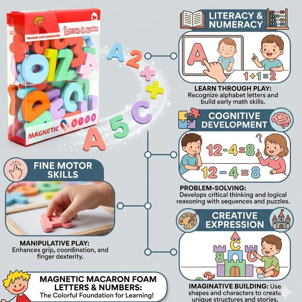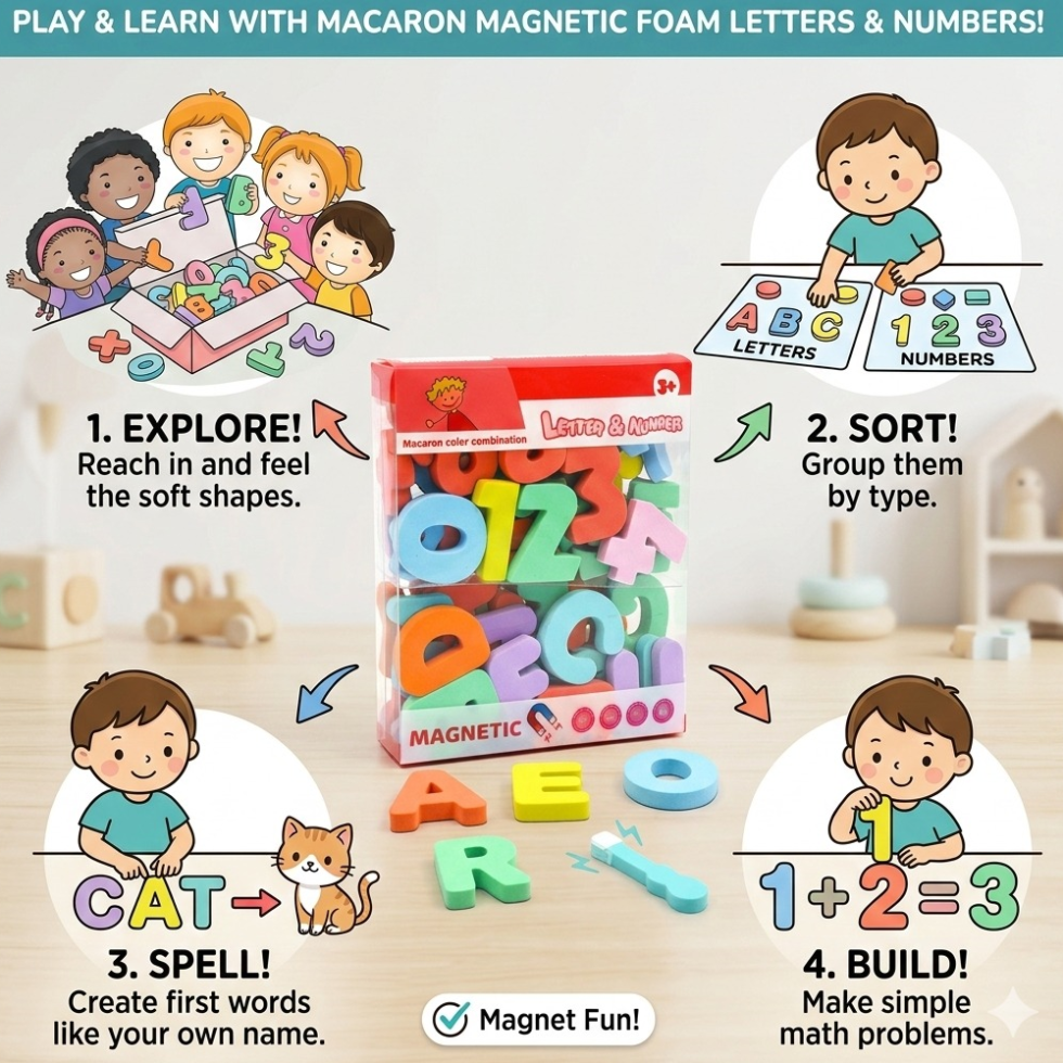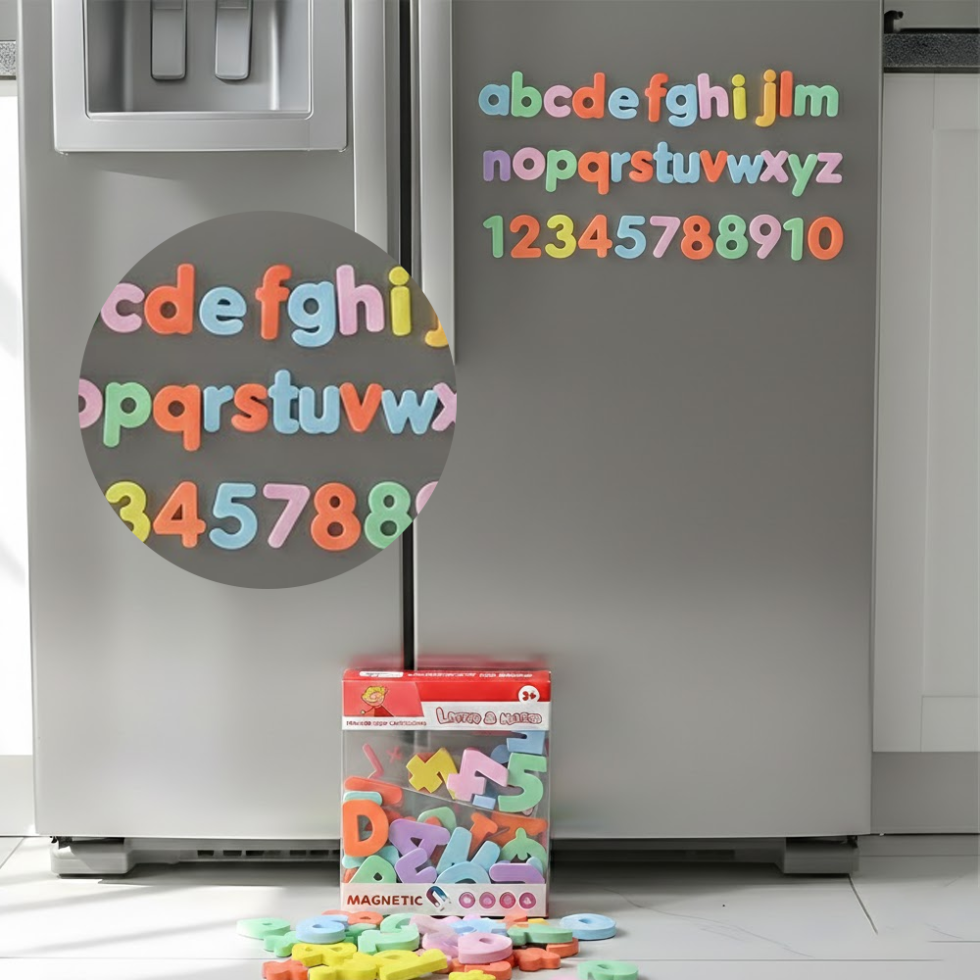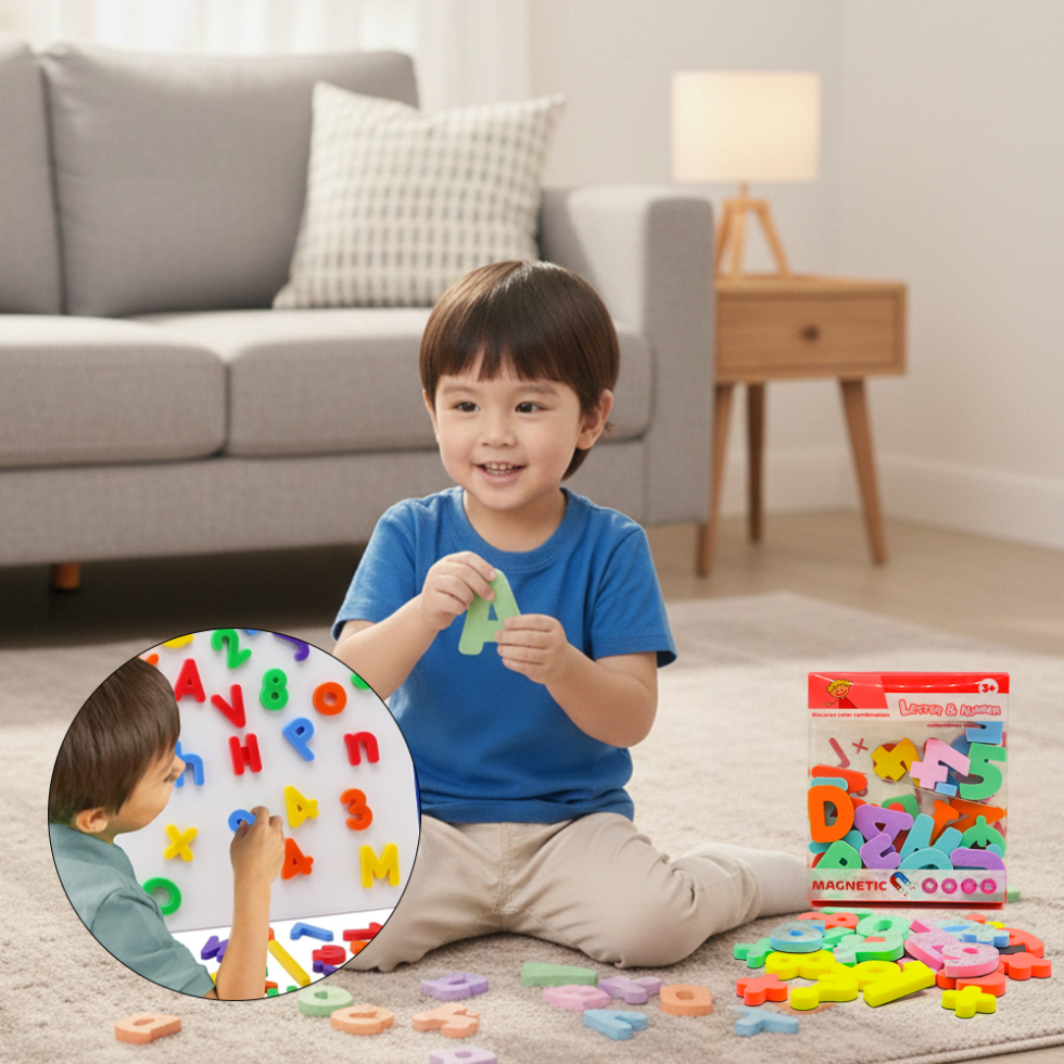 The Magnetic Letters & Numbers Educational Foam Set for kids 3+ years. This colorful learning toy helps children recognize alphabets, numbers, and basic math symbols in a fun and interactive way. Made from soft foam with strong magnetic backing, it easily sticks to whiteboards and refrigerators. Perfect for preschool learning, homeschooling, and early childhood development.
