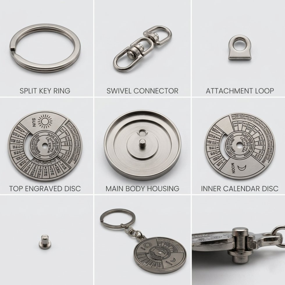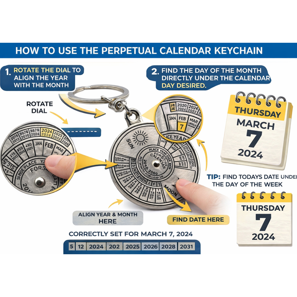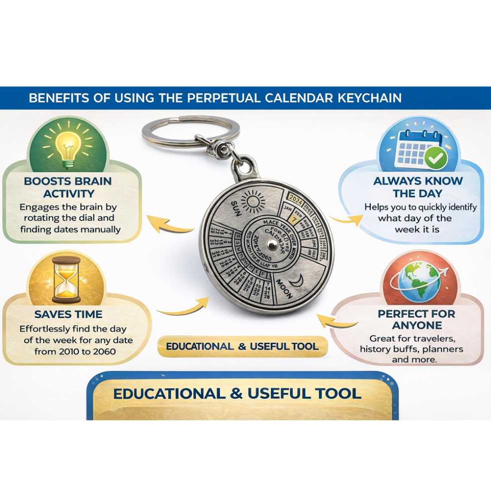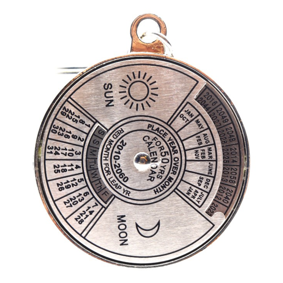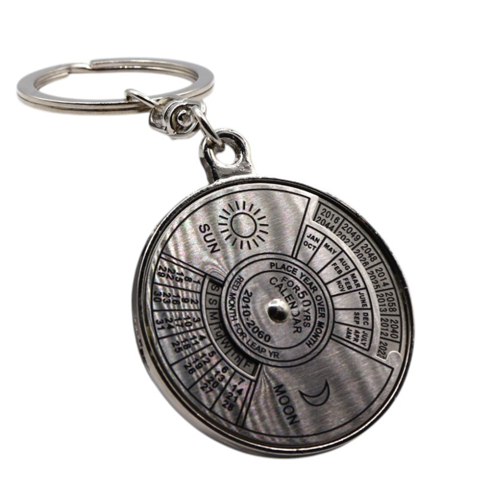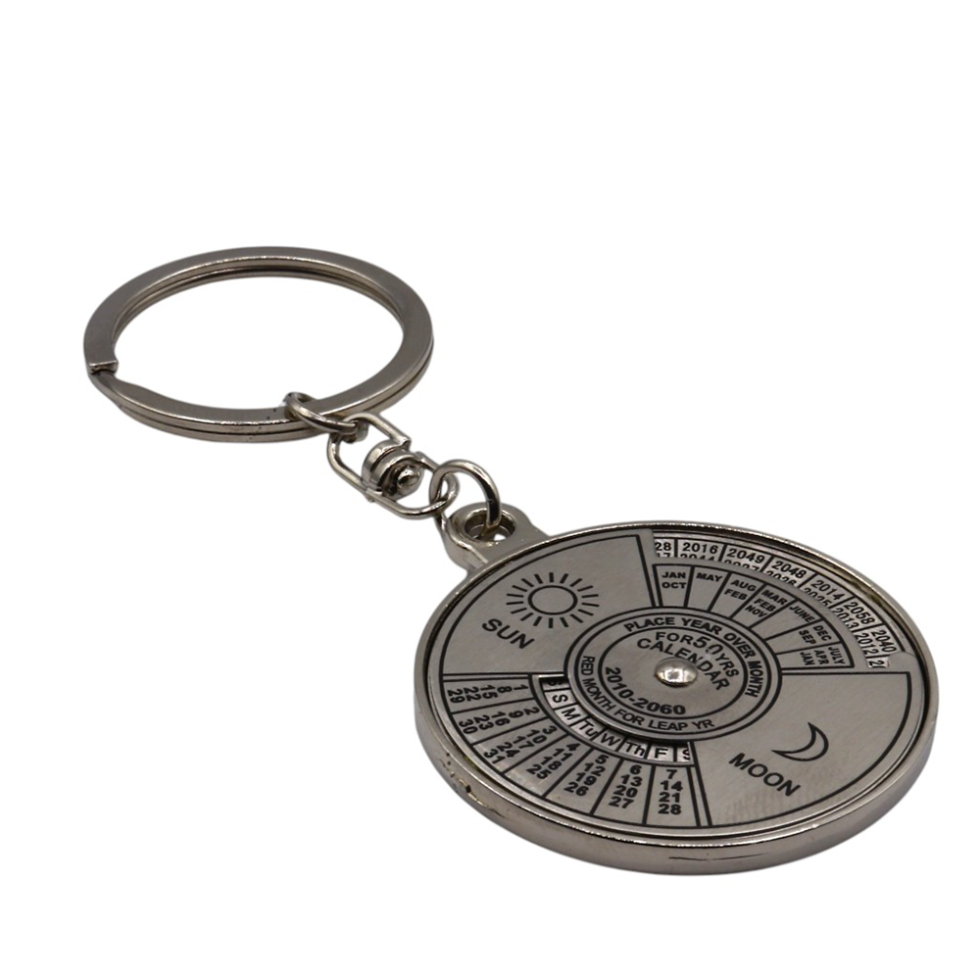 Combine style and functionality with the Metallic Key-Chain with 50-Year Calendar. This compact and durable keychain is perfect for keeping your keys organized while giving you a handy reference for dates for the next 50 years.