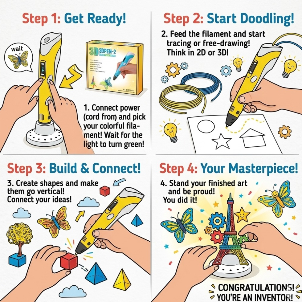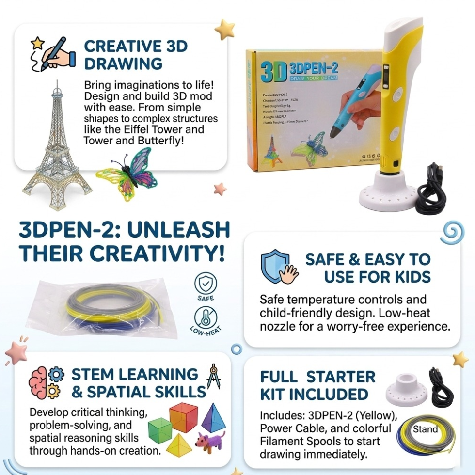 The pen is easy to hold and simple to use, making it perfect for beginners and young creators. It helps children improve their creativity, hand-eye coordination, and problem-solving skills while enjoying a fun DIY drawing experience.