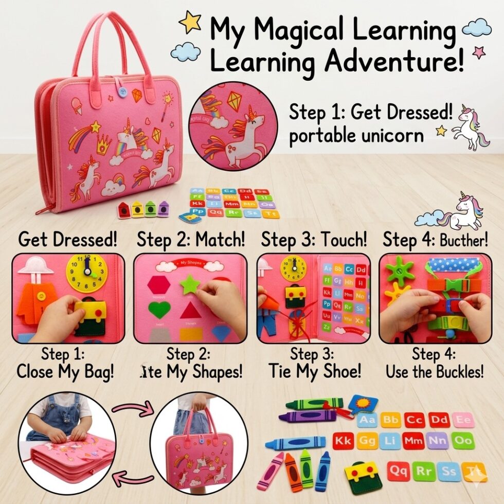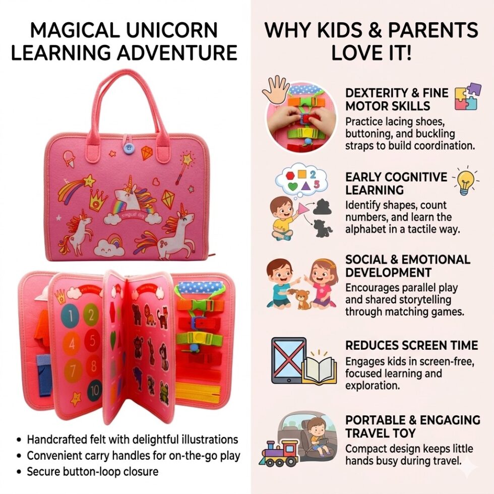 Encourage early learning and creativity with the Unicorn Montessori Educational Toy Book. Designed with a cute unicorn theme, this interactive activity book helps children develop essential skills through fun and engaging activities.